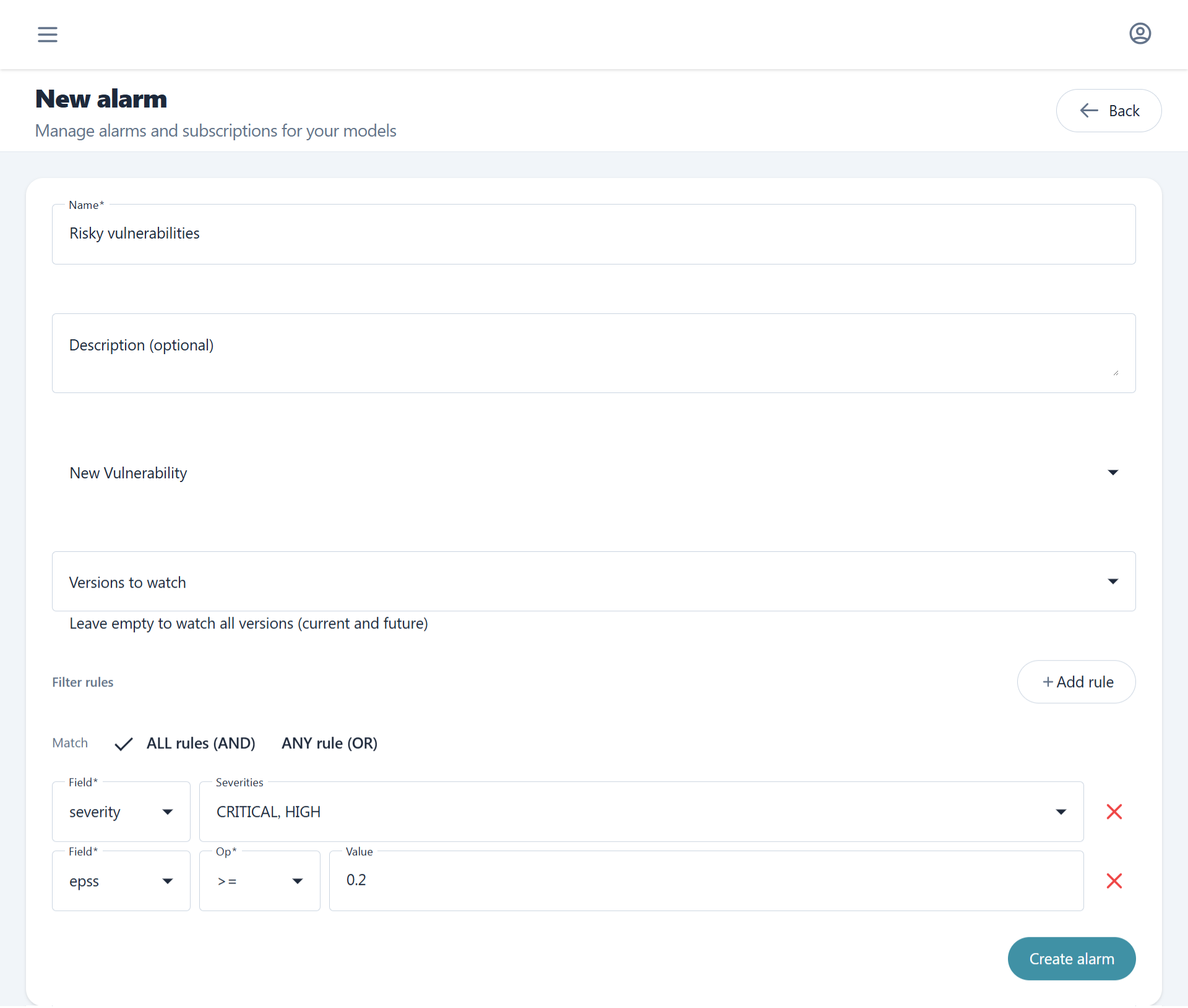 Alarms define CVSS and severity-based rules that trigger email notifications when monitored detect relevant events. For guidance on configuring alarms as part of an ongoing firmware maintenance practice, see SBOM Tracking. An alarm is scoped to a specific model and can target all firmware versions under that model or a specific subset.