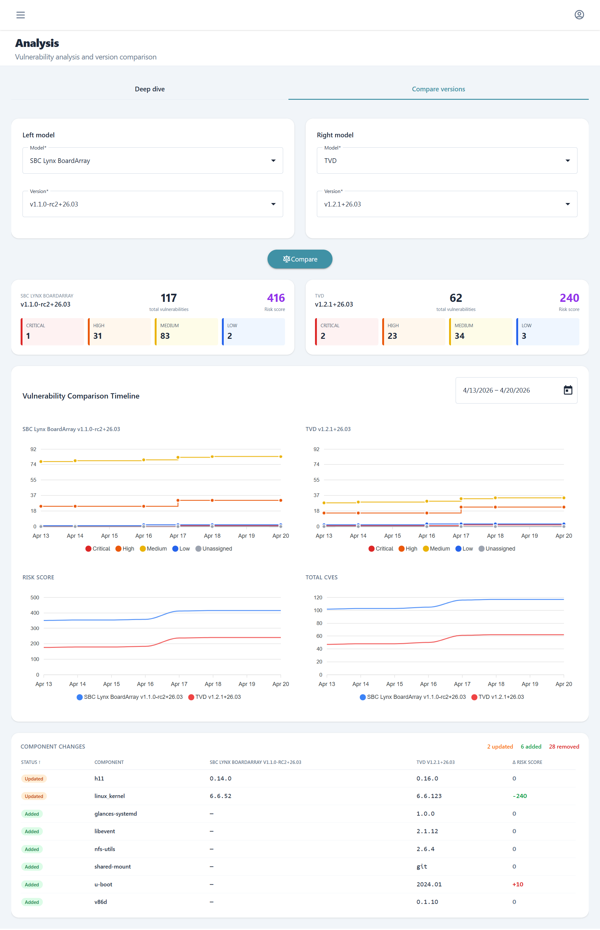 The Compare Versions tab enables side-by-side historical comparison across different models and firmware versions. Beyond vulnerability metrics, this view provides a detailed component change analysis showing which software components were added, removed, or updated between selected version pairs, making it easy to identify the source of new vulnerabilities or security improvements.