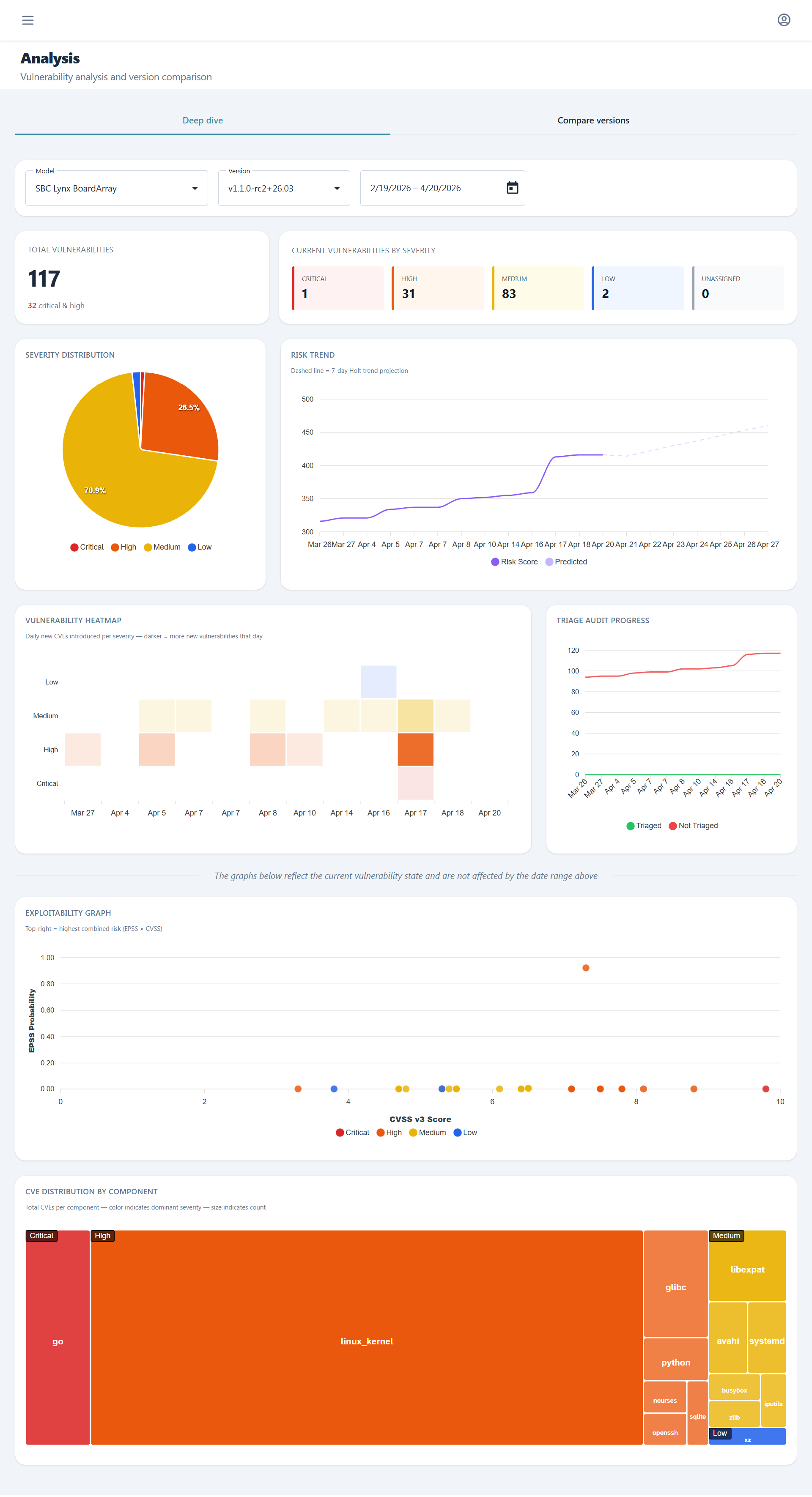 The Deep Dive tab offers comprehensive historical graphs and metrics for a specific model and firmware version. This view enables detailed temporal analysis of vulnerability patterns, severity distributions, and risk score evolution, helping teams understand how the security profile of a particular firmware version has changed over its lifecycle.