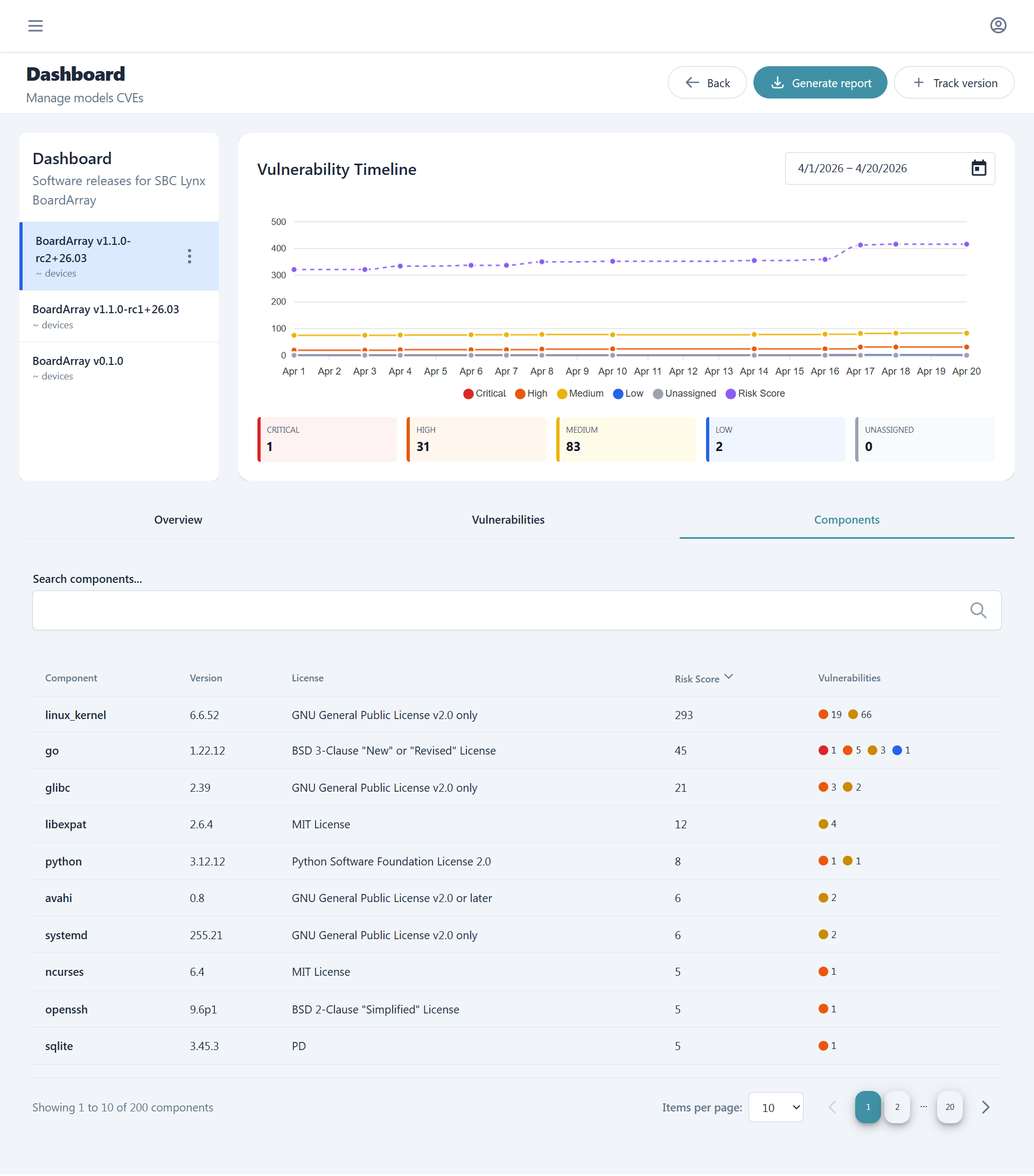 The last tab, Components, contains the list of all the components contained in the selected firmware version and for each we can see name, version, license, risk score and a summary of affecting vulnerabilities.