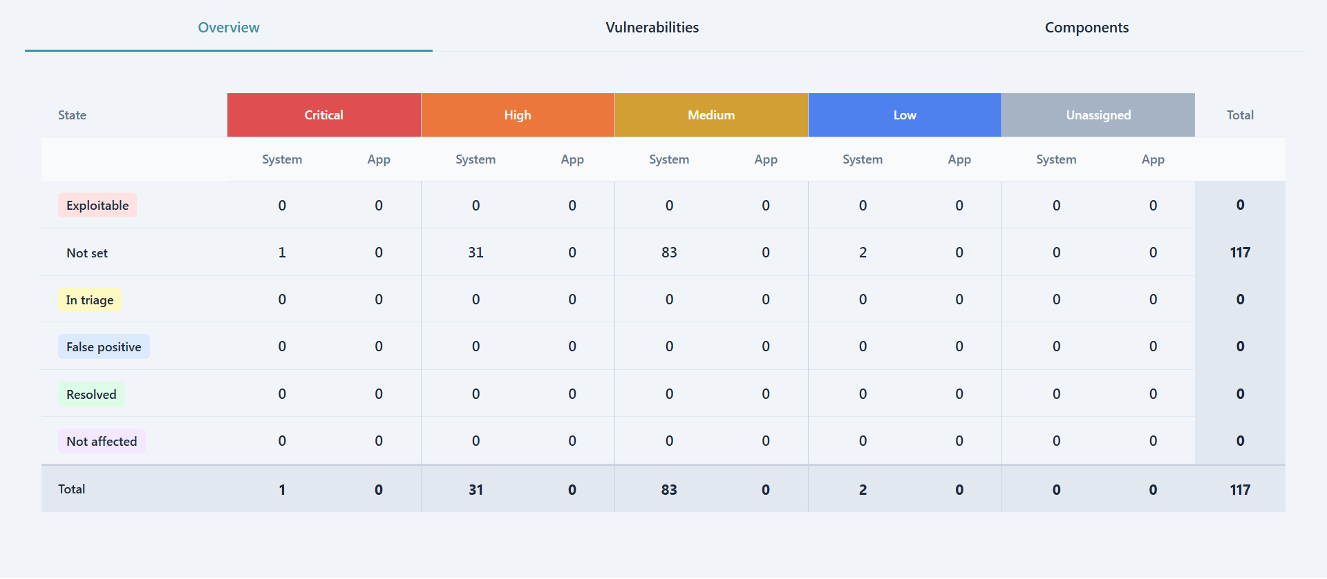 The overview tab shows for the currently selected firmware version a severity, triage and separation of concerns matrix. Each cell is clickable and forwards the user to the respective filtered Vulnerabilities list.