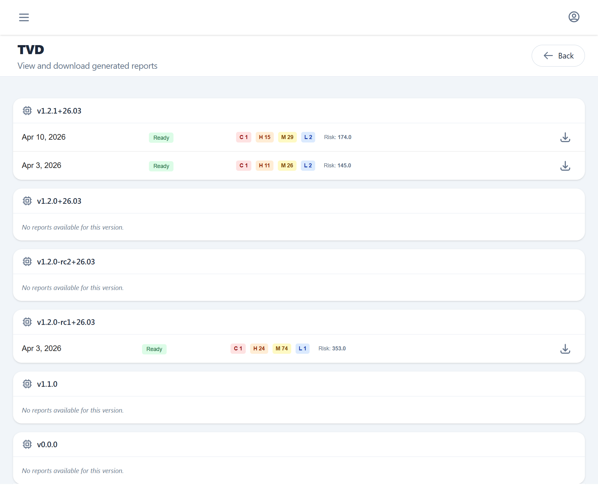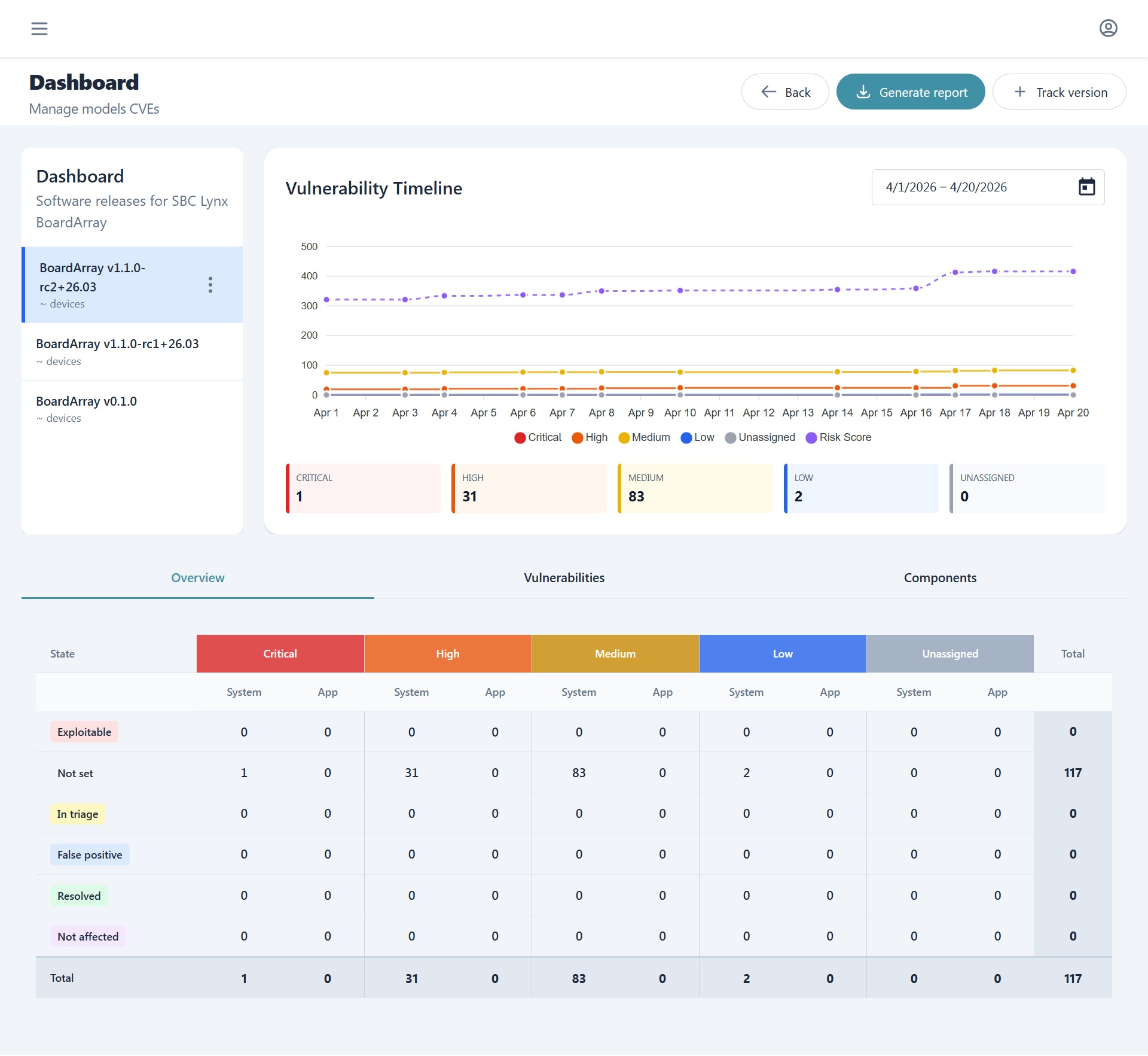 The dashboard empowers the user to switch between different firmware versions while being able to check, at a glance, current and historical data about vulnerabilities. From here one can also generate accurate and tracked reports or perform triage of affecting vulnerabilities.