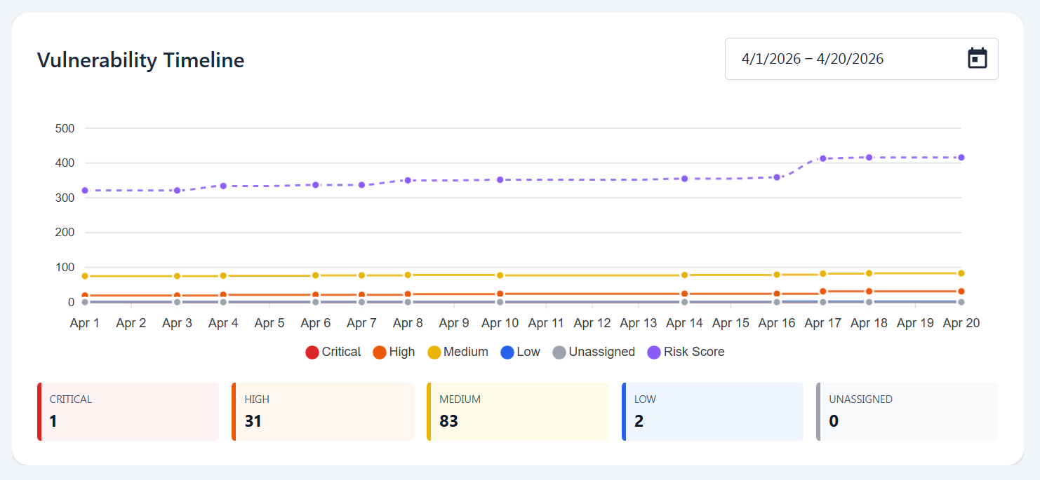 The vulnerability timeline shows the historical data of vulnerabilities per severity and risk score while enabling the user to select whichever time interval of the tracked sbom and decide which are the information they want it to report with a simple click.
