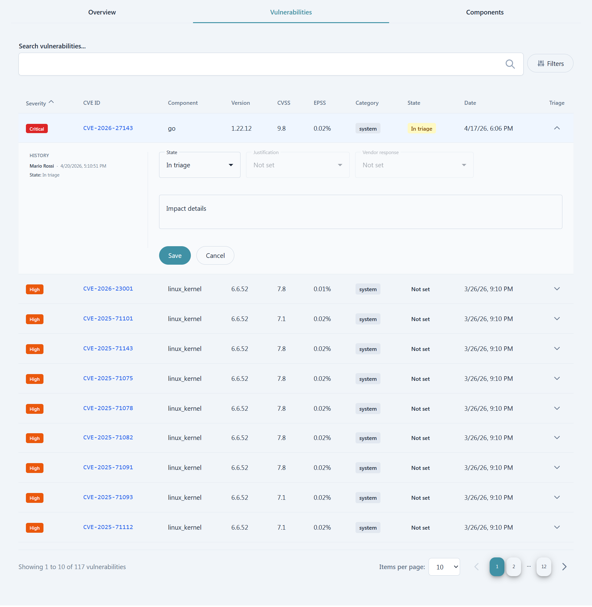 Inside the Vulnerabilities tab the list of affecting vulnerabilities is present. Users can filter either by searching directly for specific CVEs or components or by leveraging the more customizable filtering options.