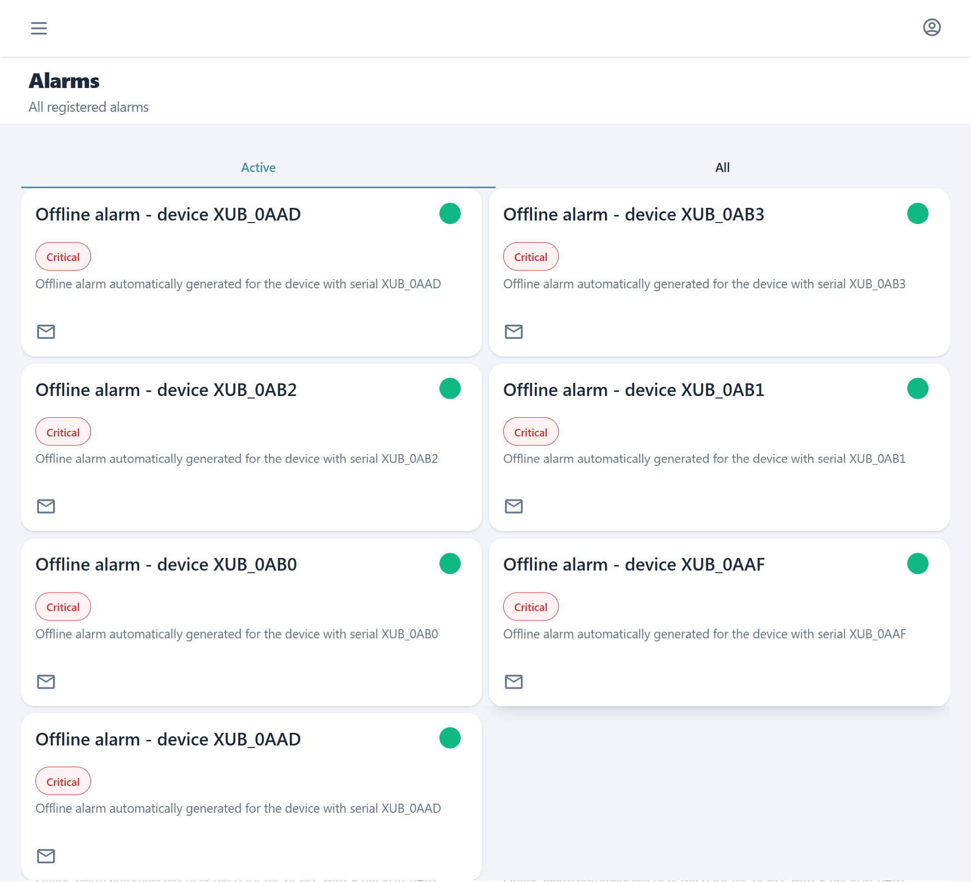 The Alarms view aggregates alarm events across all devices in the fleet, providing a cross-device overview without having to navigate to individual device pages.