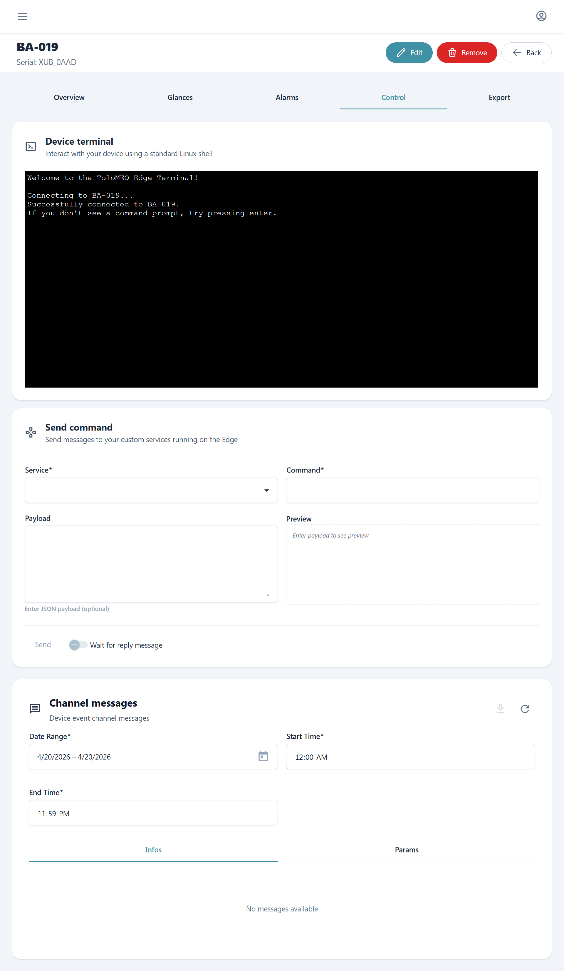 | Control | Panel for sending commands and actions to the device and viewing command history |