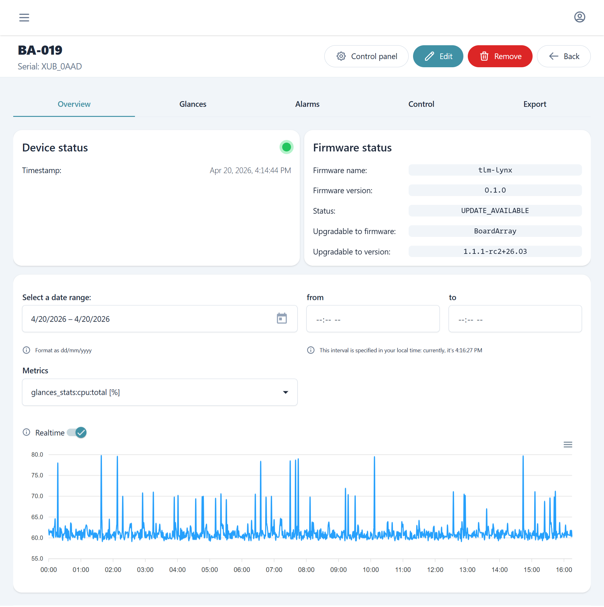 | Overview | Current connectivity, firmware status and latest metrics charts |