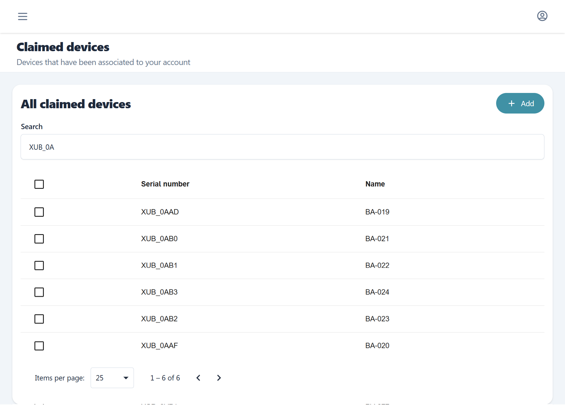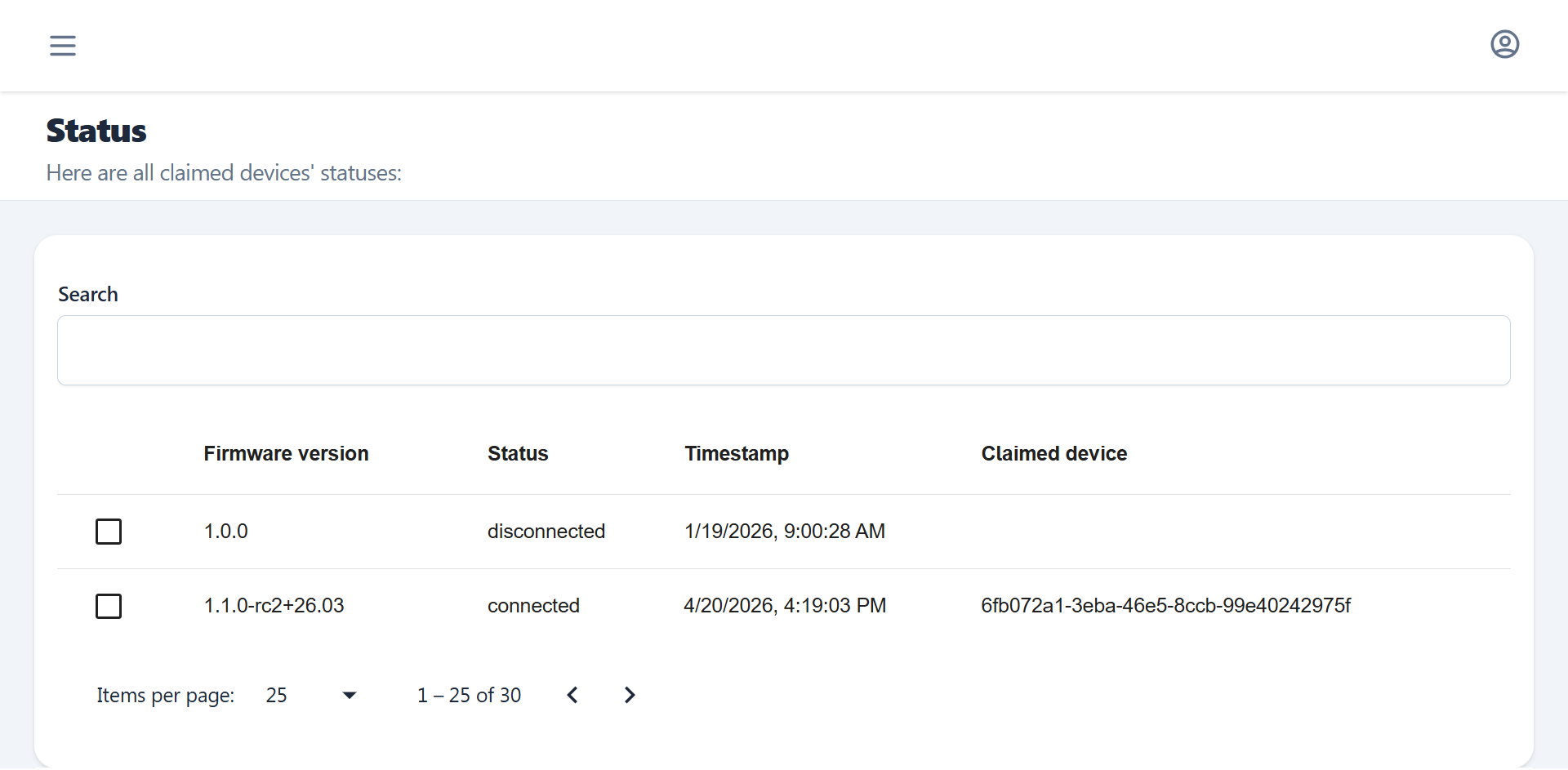 The main view shows all provisioned devices for the tenant with the option to search for them by name or serial. While also giving the option to provision new ones (view Provisioning flow).