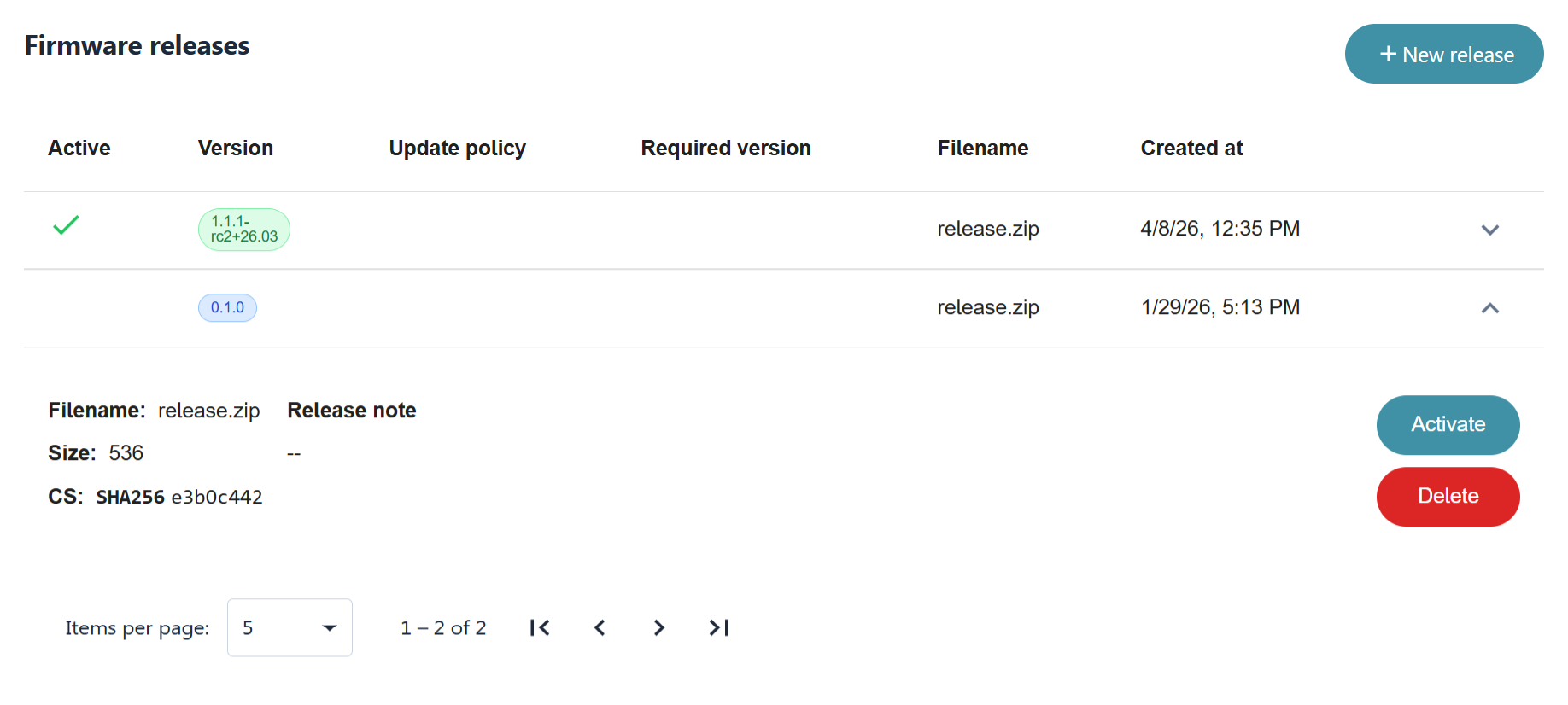 Once the release is registered on the model, activate it. Activation signals to the platform that devices running an older firmware version on this model should receive the update. Devices that are online and provisioned are notified and can begin the update flow described in Steps 4 and 5 via commands.
