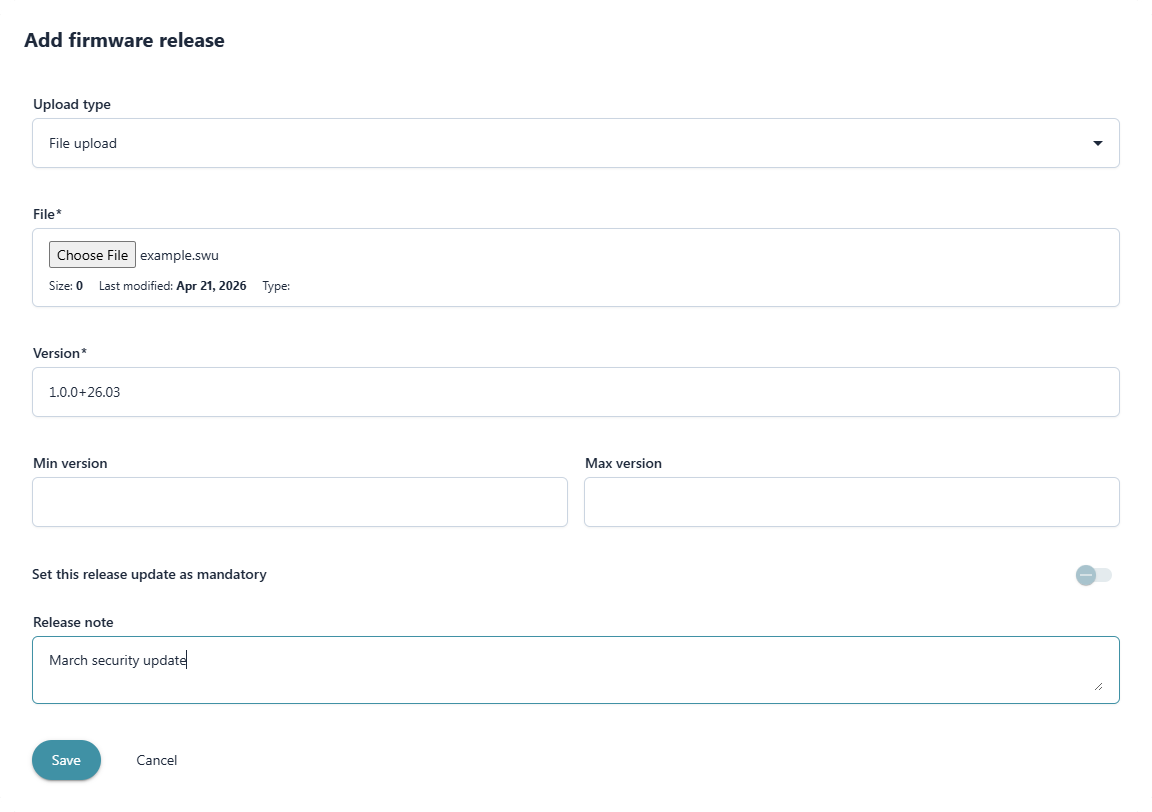 hardware and firmware version. Upload the .swu package produced in Step 1. The file is
