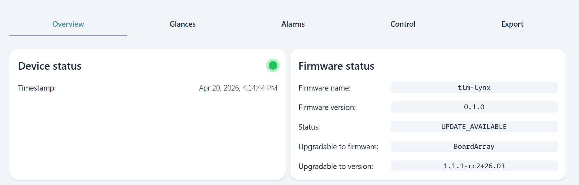 As each device works through the state machine, its current OTA state is visible in the Overview section of its Fleet Manager detail page alongside connectivity and firmware version information.